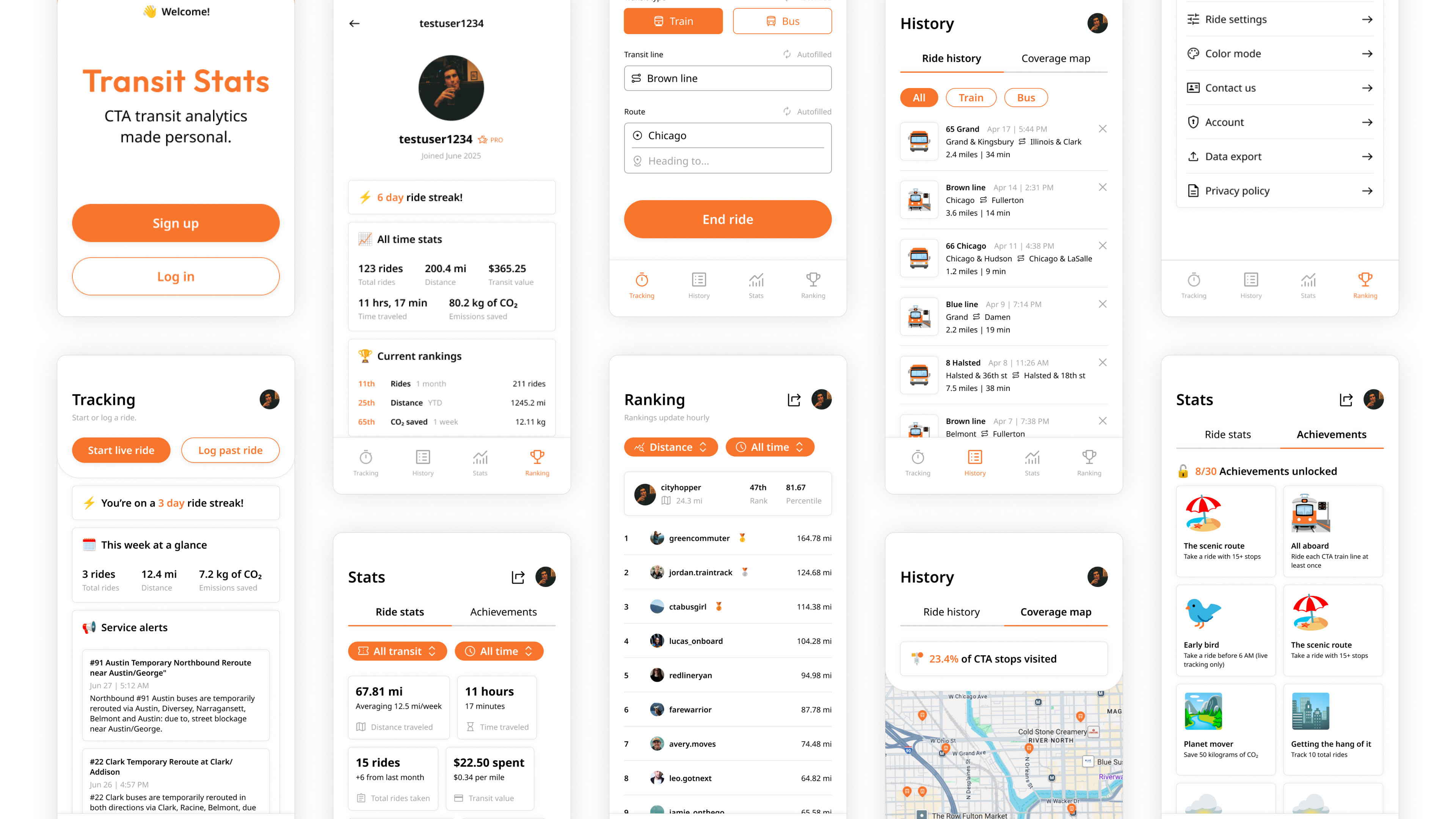 I designed and executed every core feature that makes Transit Stats unique. Auto live tracking captures rides in real-time with smart GPS detection. In-depth stats show riders their total distance, CO₂ savings, and transit spending over time. City-wide leaderboards let users compete with other Chicago riders, while the achievement system celebrates transit milestones. Ride history and coverage maps give users a complete view of their transit journey across the entire CTA network.