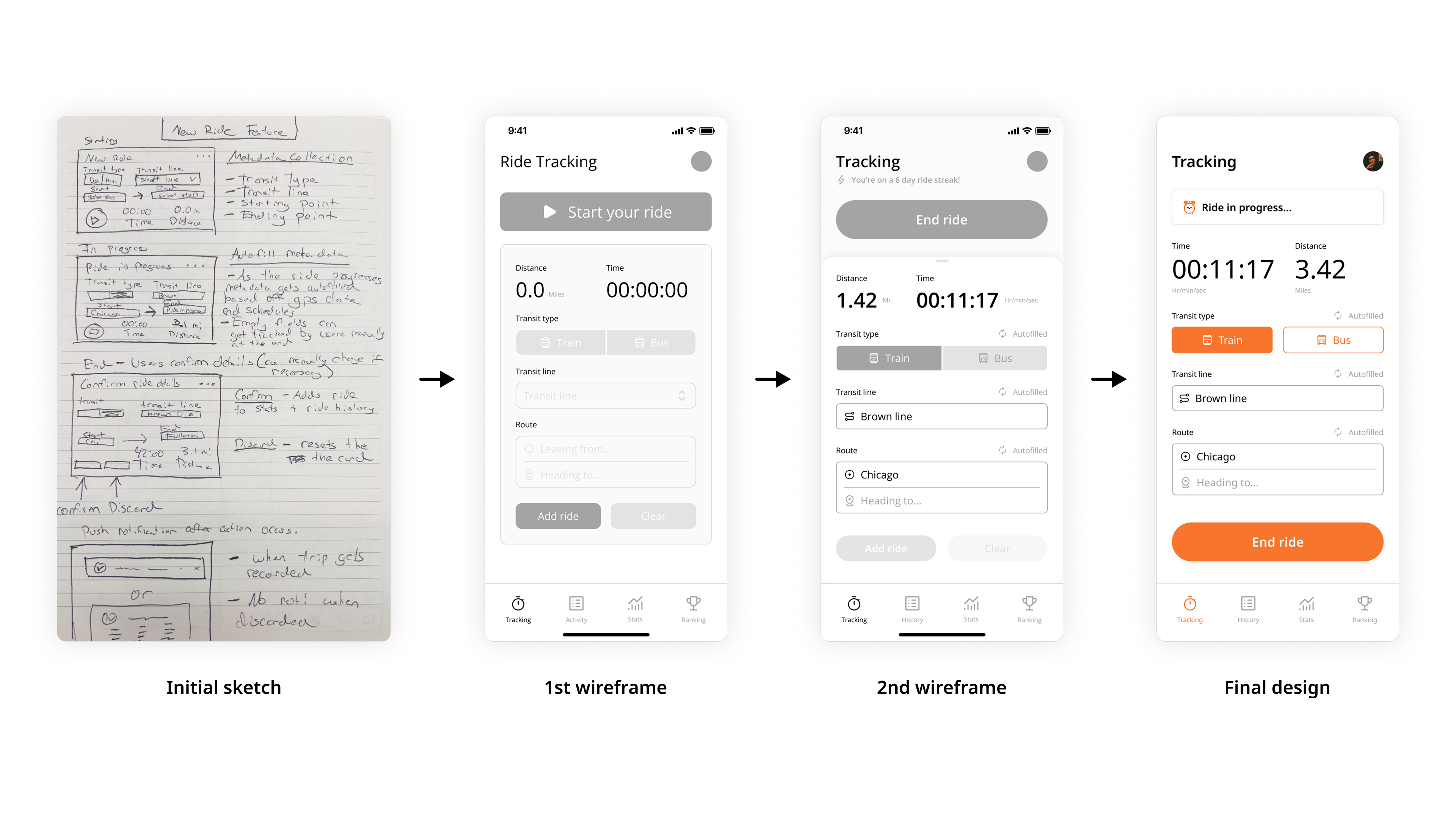 The app design evolved from early sketches to two rounds of wireframes before reaching the final polished UI. This progression shows the refinement and thinking that shaped Transit Stats from concept to launch-ready product.